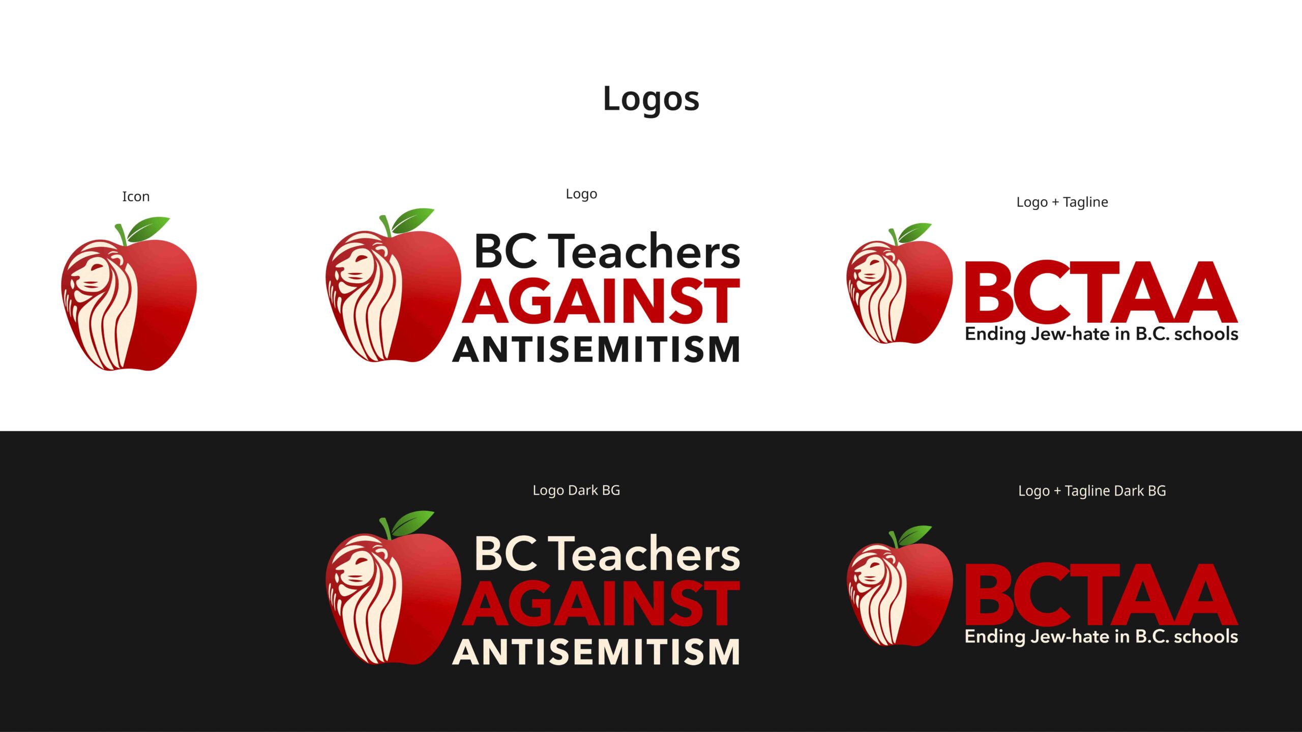 BCTAA came to us with a powerful mission: to confront and dismantle antisemitism in B.C.’s education system. As a grassroots collective of educators, their tone needed to be strong, fair, and accessible not only to Jewish communities but to the broader public. We built a brand identity that reflects this vision, steering away from traditional Jewish symbolism, instead, we created a visual language rooted in strength, education, and subtle cultural cues. For their logo, we created a lion carved into an apple to symbolize both courage and the teaching profession. (In North America, apples have long been associated with education and teachers. It’s a symbol of respect and gratitude dating back centuries.)