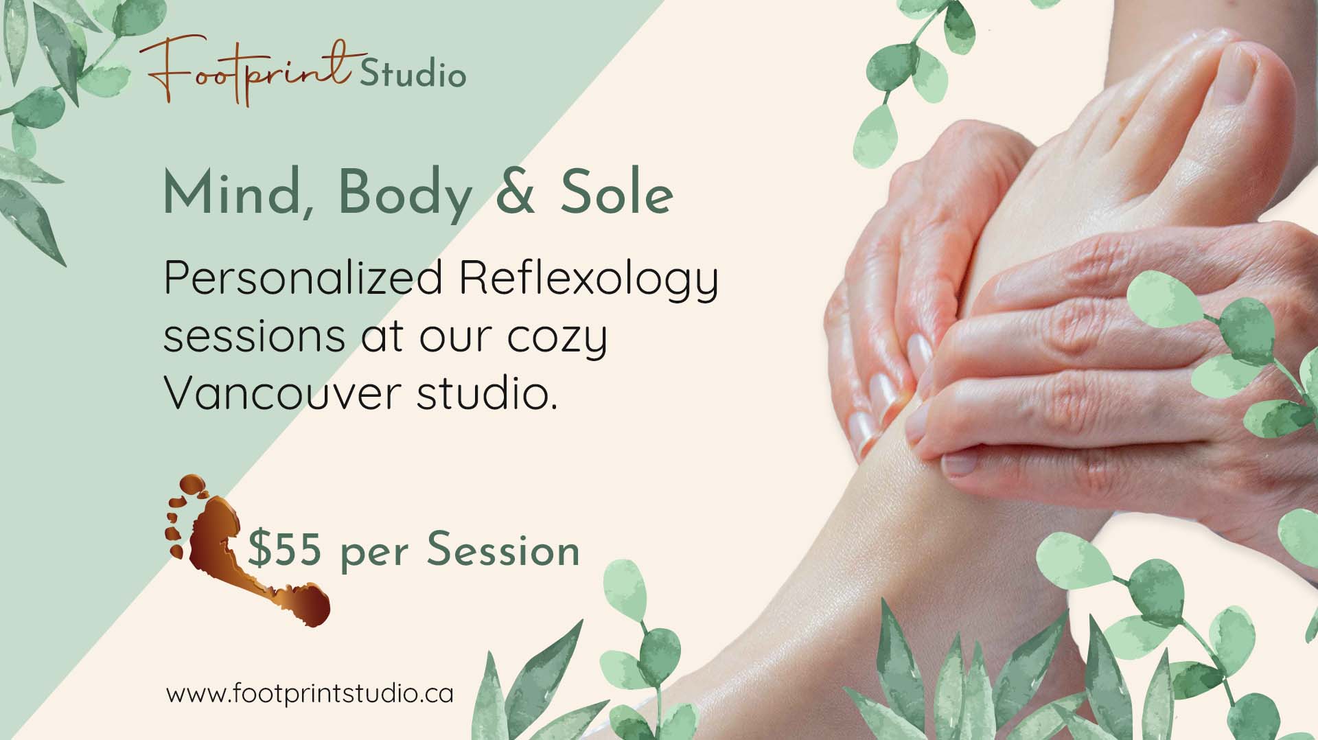 Footprint Studio is a Vancouver-based reflexology business offering both in-studio treatments and mobile visits to homes and offices. Rooted in care, comfort, and connection, the studio provides a warm, personal, and nurturing experience for clients seeking physical and emotional wellness.